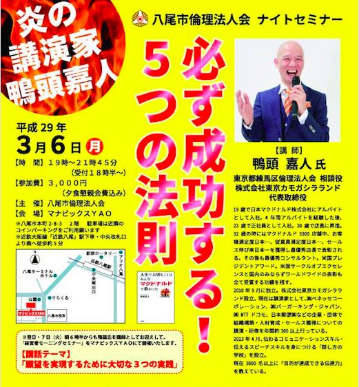 「必ず成功する!5つの法則」 なんと!!あの!! 炎の講演家・鴨頭嘉人氏が大阪府八尾市で講演!! どうやったら […]